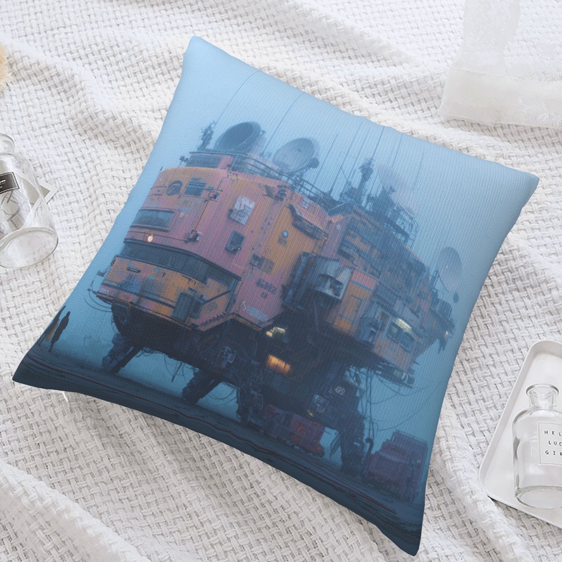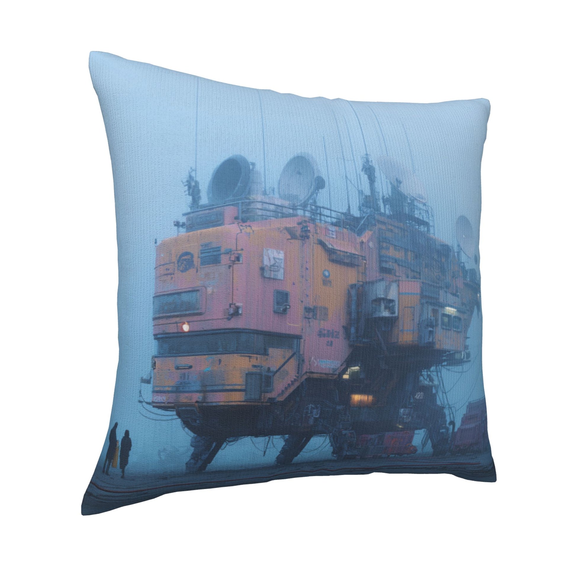 Step into a post-industrial dreamscape with this 18"x18" (45x45cm) throw pillow cover featuring a massive mechanical base shrouded in dense mist. Complete with communication arrays, radar dishes, and towering structures, the design blends cyberpunk aesthetics with a dystopian mood—where color, metal, and fog merge into an evocative sci-fi environment.