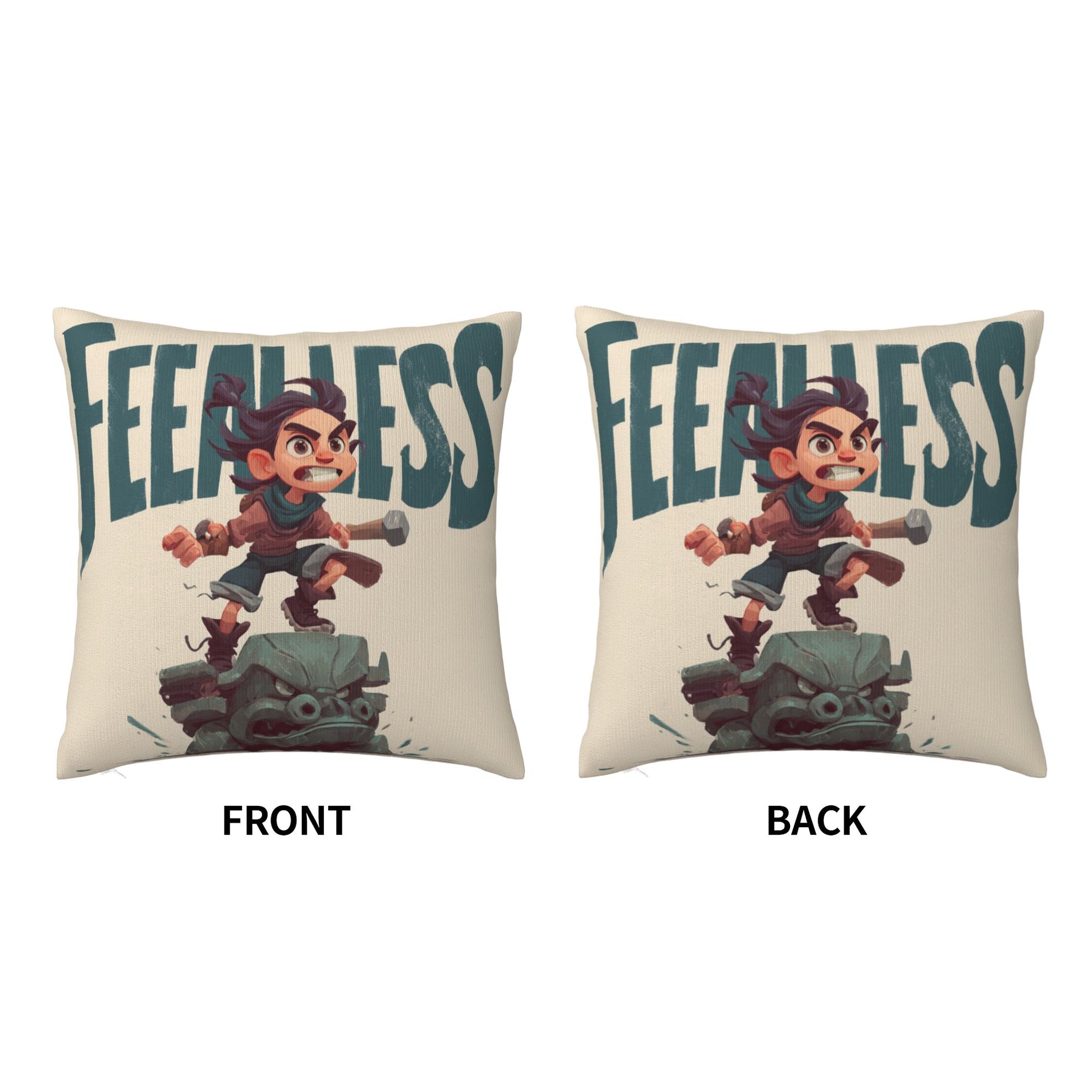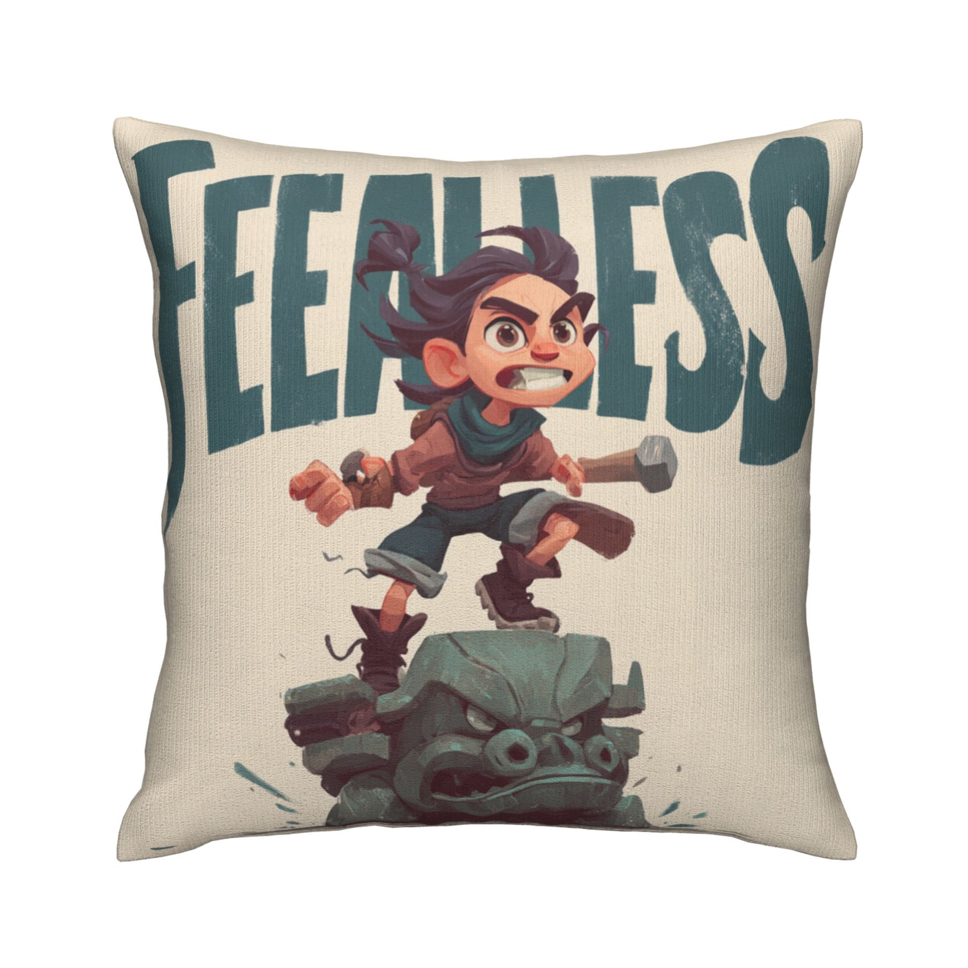 Inject a bold and inspiring spirit into your living space with this 18"x18" (45x45cm) Fearless-themed cartoon pillow cover. Featuring a dynamic anime-style illustration of a brave young warrior standing defiantly atop a stone monster statue, this design captures the essence of courage, grit, and heroic adventure. Behind the figure, the word “FEARLESS” stands tall and proud, delivering a strong visual message that energizes any room.