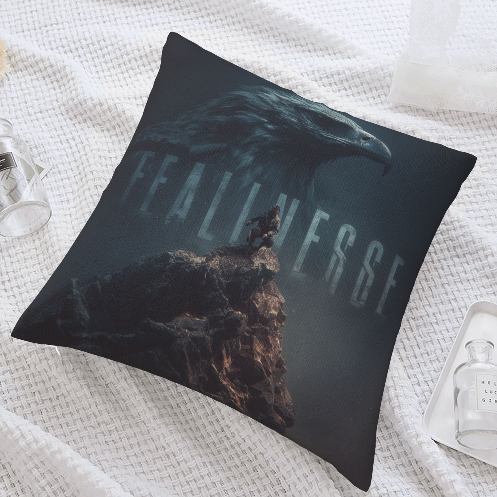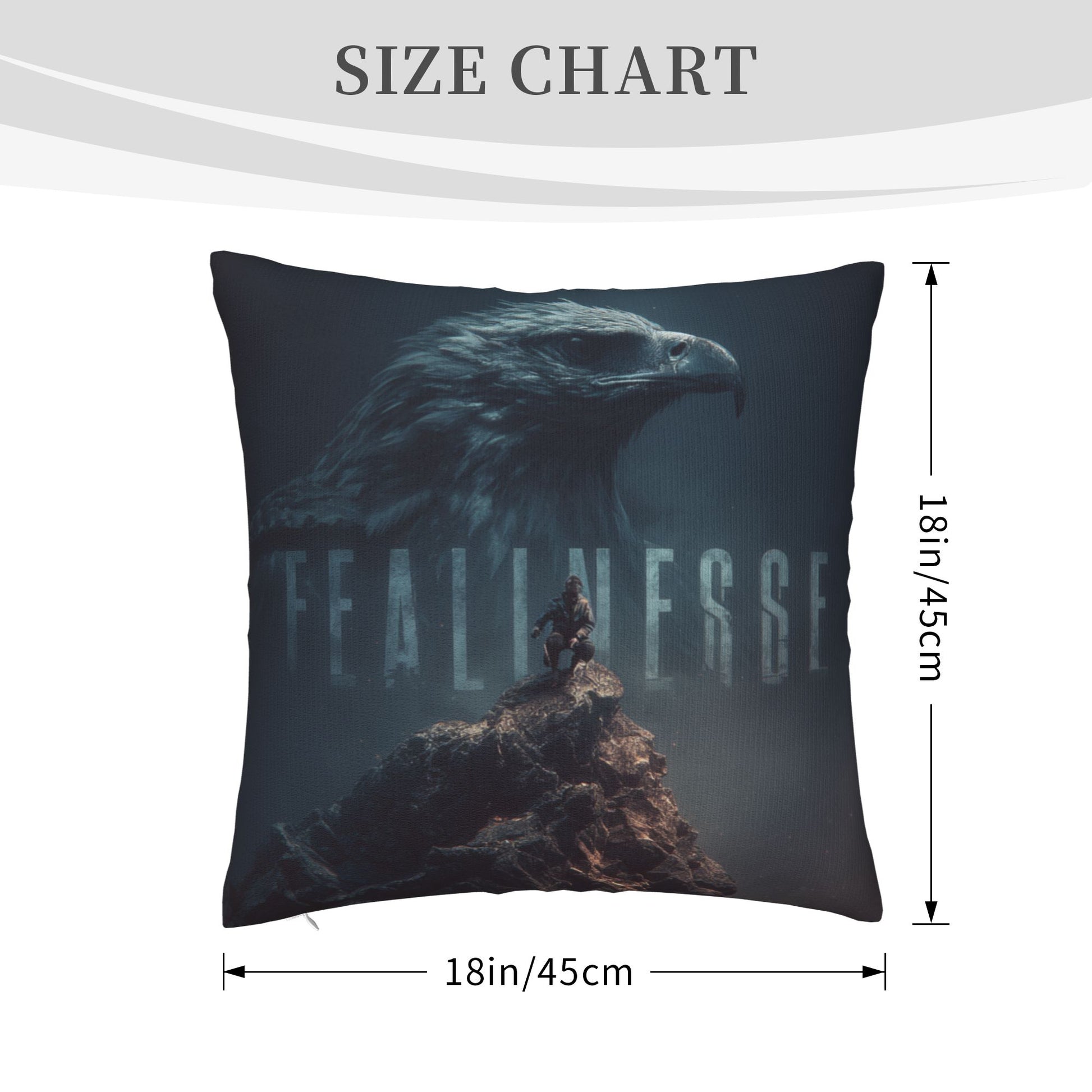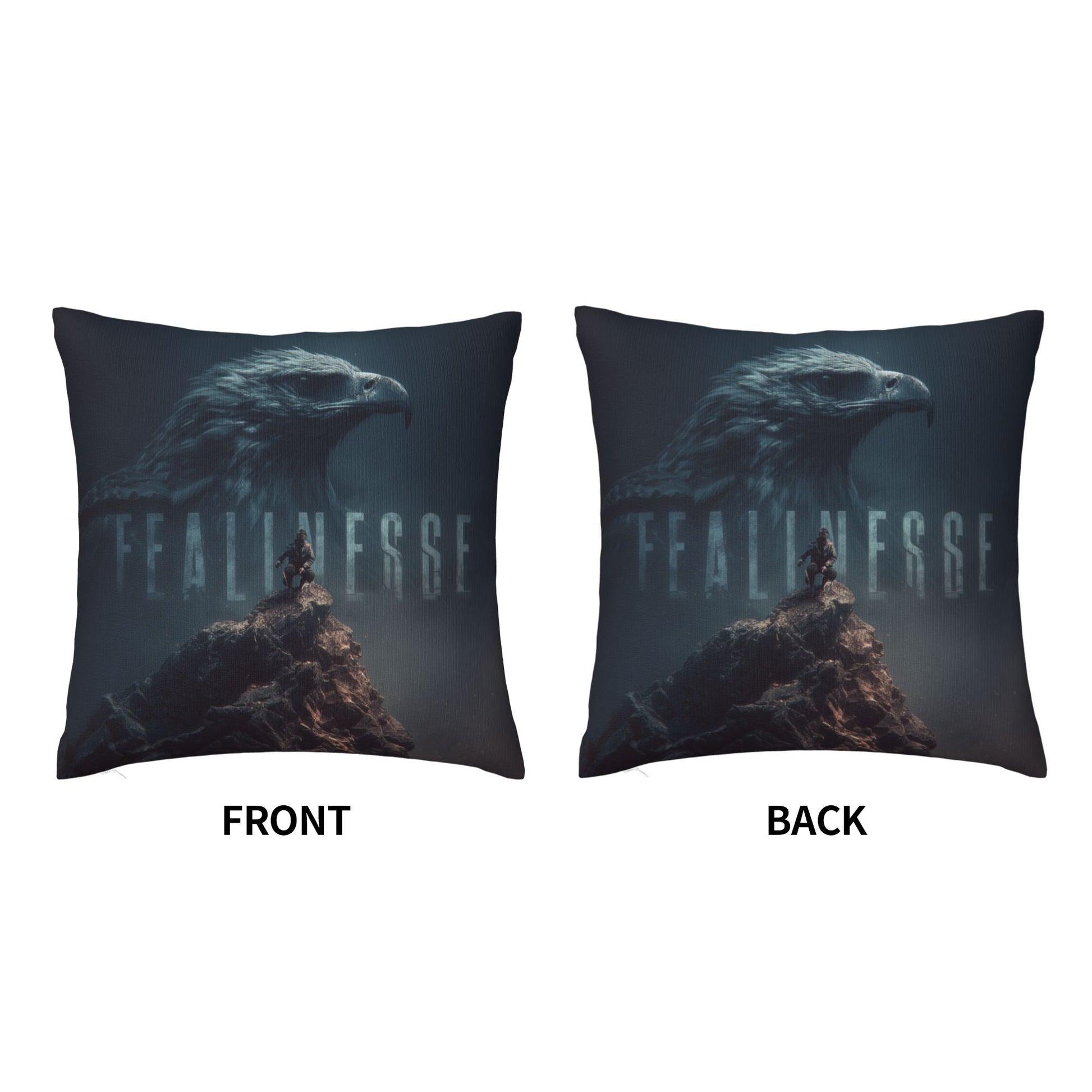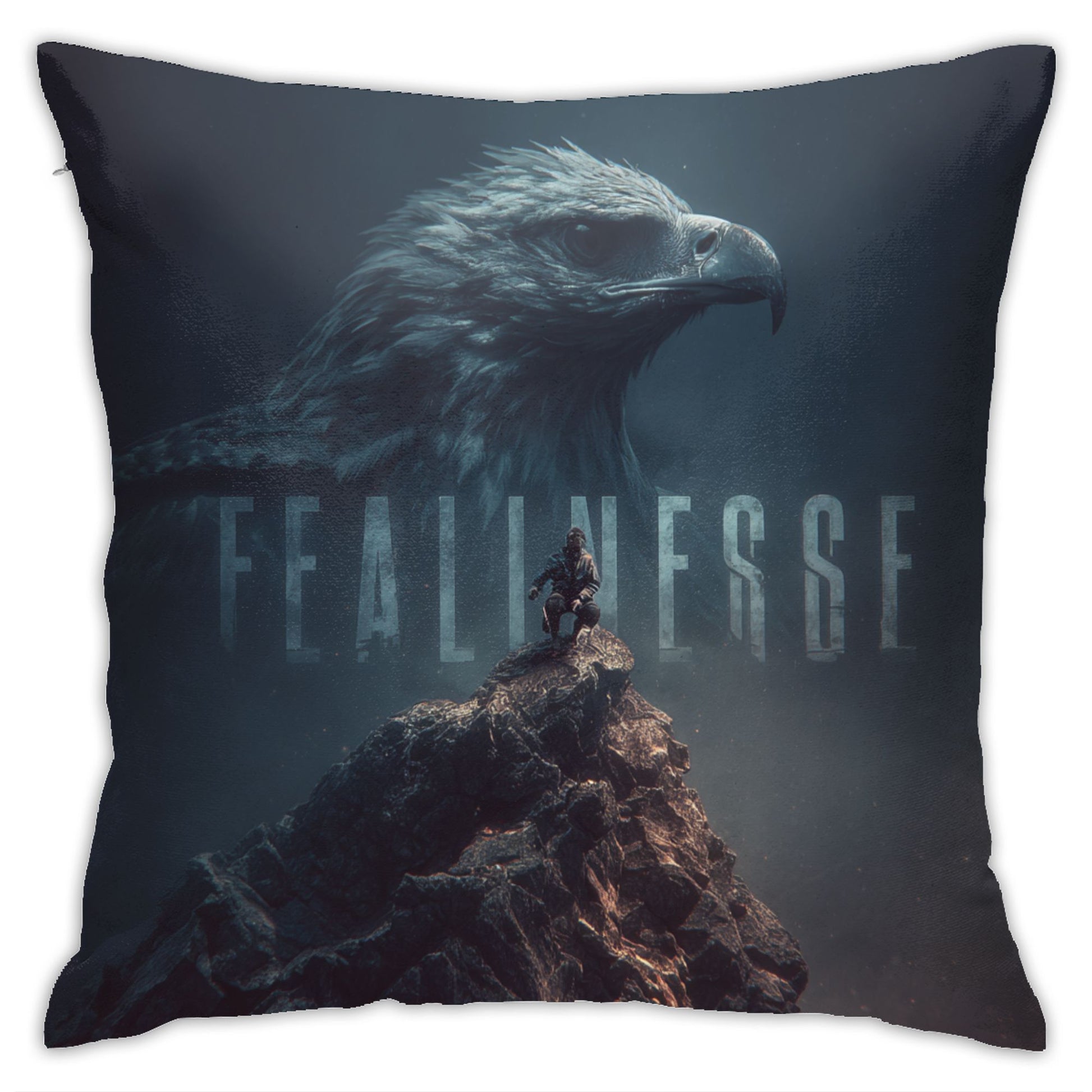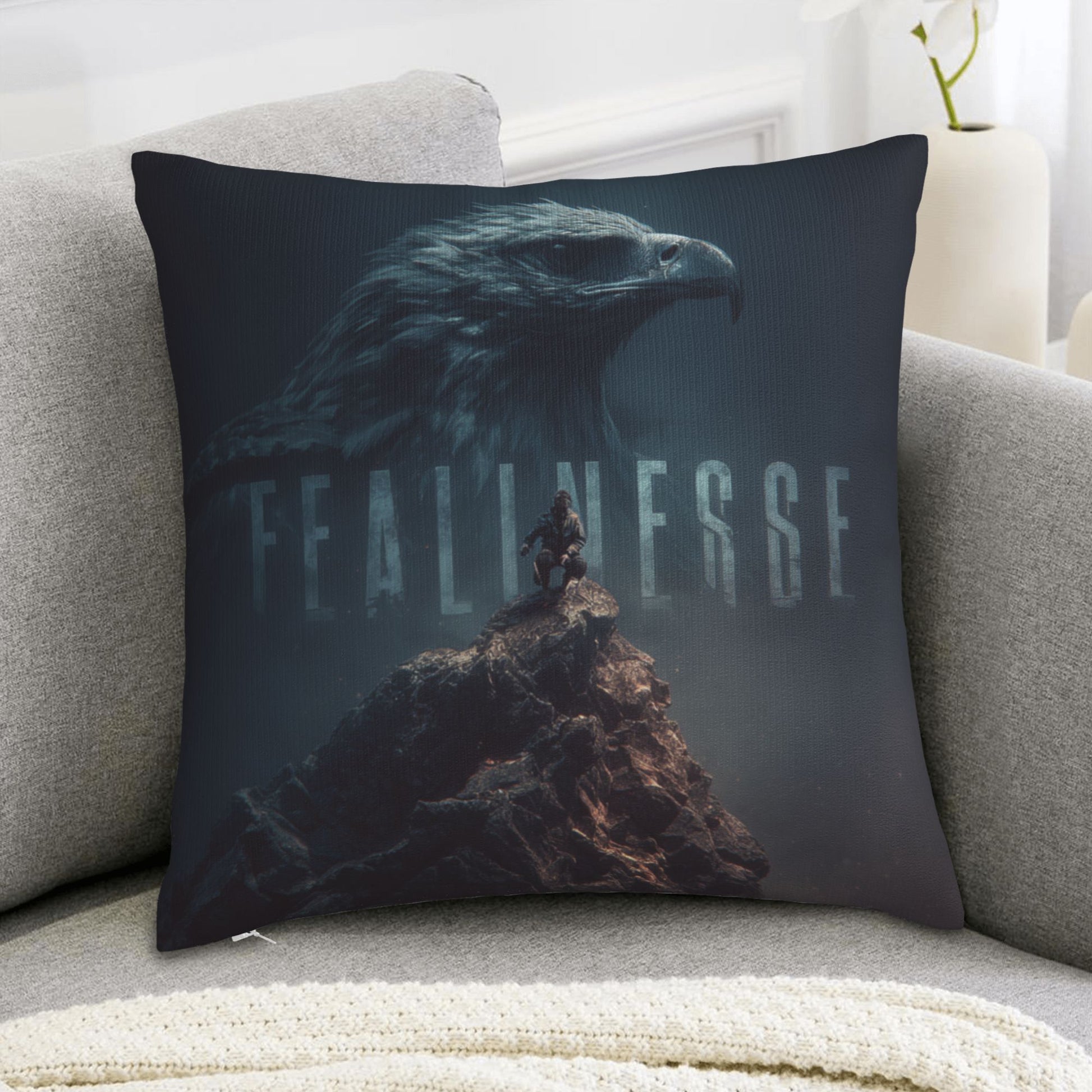 Ignite inner strength and purpose with this 18"x18" (45x45cm) throw pillow cover, featuring a breathtaking composition of a majestic eagle overlooking a lone climber standing atop a rugged peak. The word “FEARLESSNESS” is subtly embedded within the eagle's silhouette, creating a powerful visual metaphor for vision, resolve, and unwavering courage.