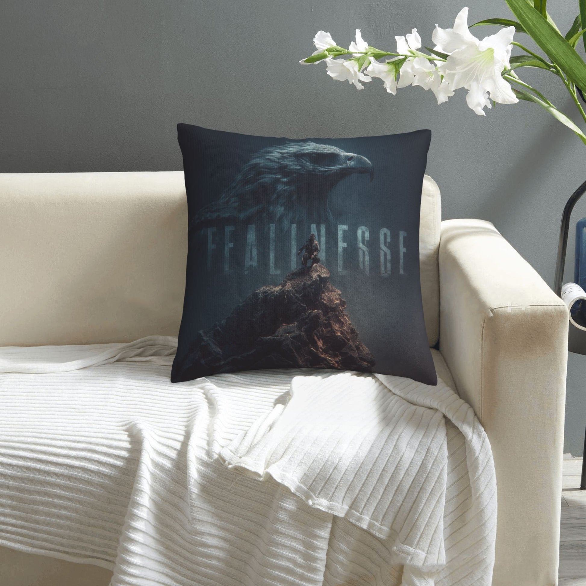 Made from high-quality polyester, the pillow cover is soft, durable, and resistant to wrinkles and fading. Printed in high-resolution, it captures every detail—from the texture of the feathers to the contours of the rock—with cinematic clarity. The back features a solid color and a hidden zipper for convenience and aesthetic consistency.