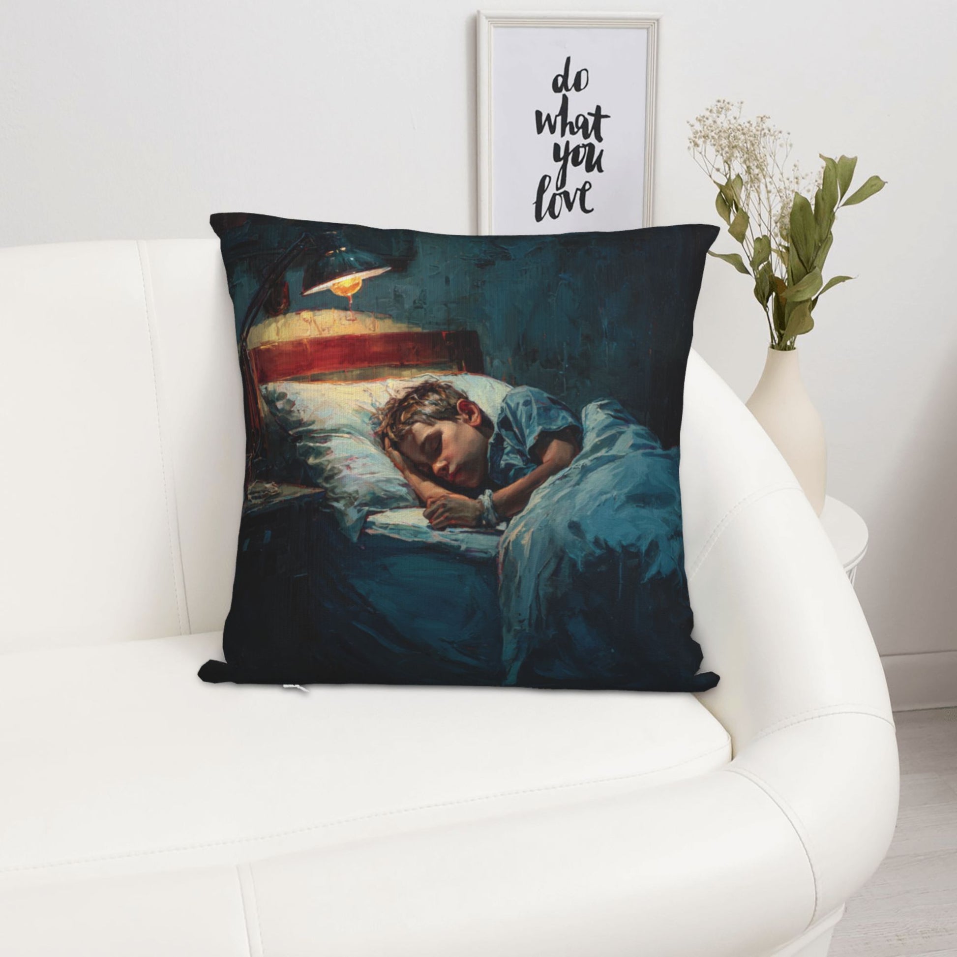 Wrap your space in warmth and tranquility with this 18"x18" (45x45cm) throw pillow cover, featuring a beautifully painted image of a young boy peacefully sleeping under the soft glow of a bedside lamp. Captured in a painterly oil-style rendering, the scene radiates calm, childhood innocence, and the comforting silence of night—perfect for creating an emotionally resonant and gentle ambiance in your home.